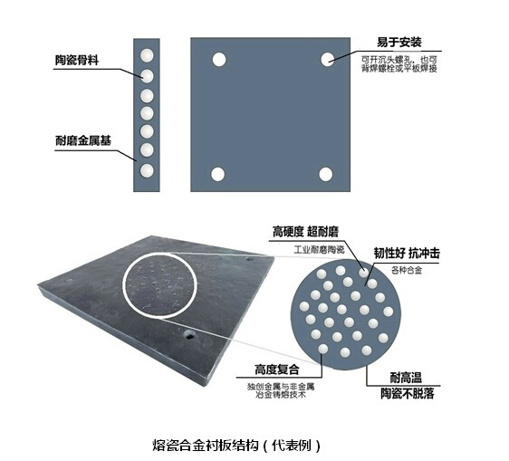熔瓷耐磨襯板由耐磨陶瓷骨料和高韌金屬基構成,巧妙的強化了成分材料的各自優點,避開了各自的弱點,解決了陶瓷耐磨不抗沖擊,金屬有韌性而不耐磨的組合難題。